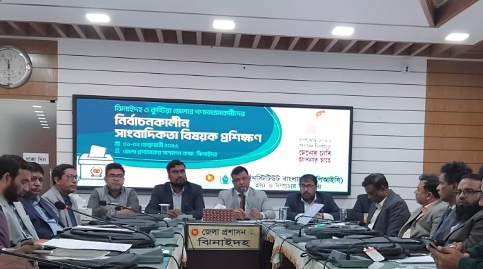 এম এ কবীর,নিজস্ব প্রতিনিধিঃ ঝিনাইদহ জেলা প্রশাসকের সম্মেলন কক্ষে ঝিনাইদহ ও কুষ্টিয়া জেলার গণমাধ্যমকর্মীদের জন্য নির্বাচনকালীন সাংবাদিকতা বিষয়ক প্রশিক্ষণ কর্মশালা শনিবার শুরু হয়েছে। সকালে প্রশিক্ষণ কর্মশালার উদ্বোধন করেন ঝিনাইদহের জেলা